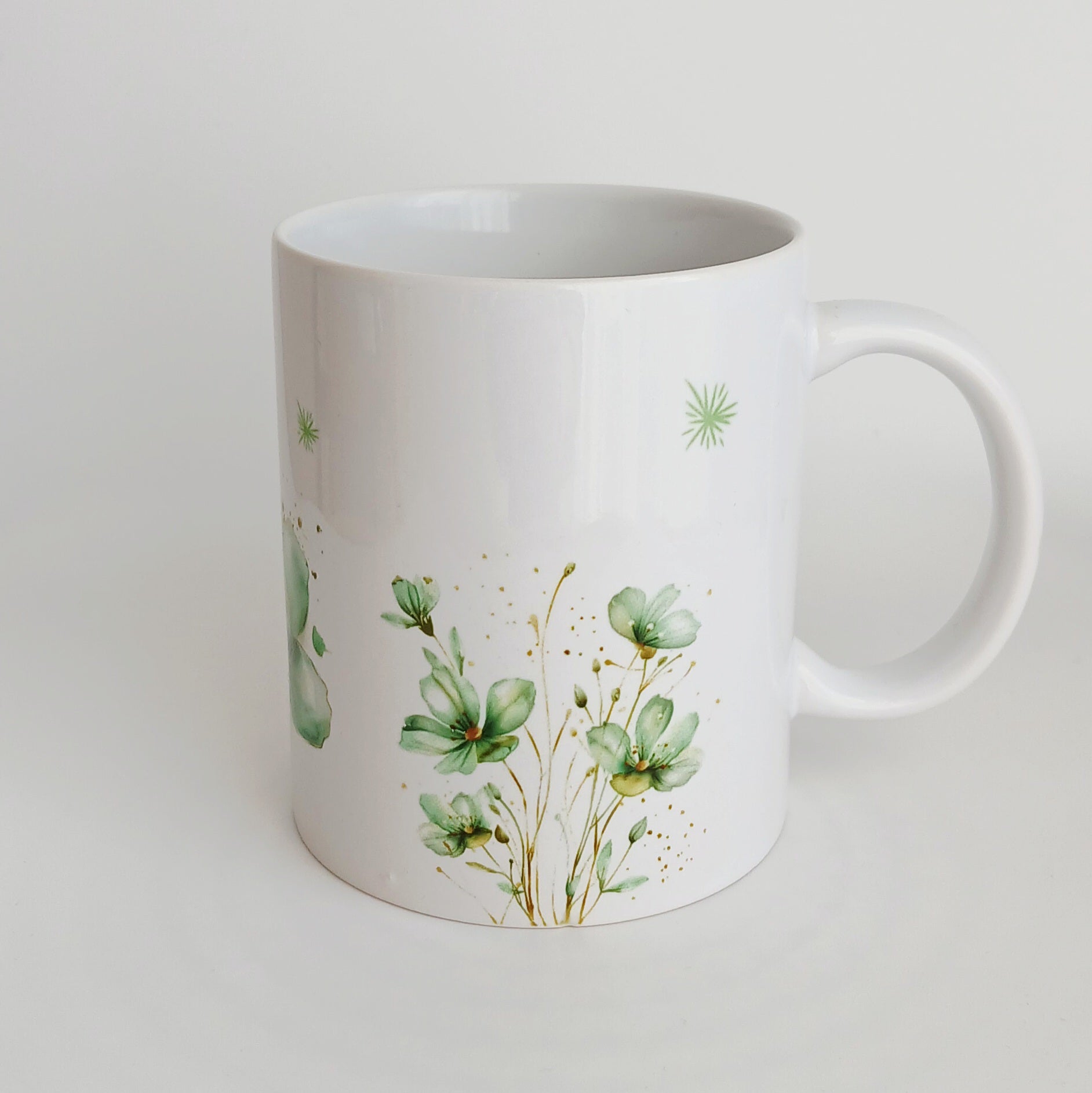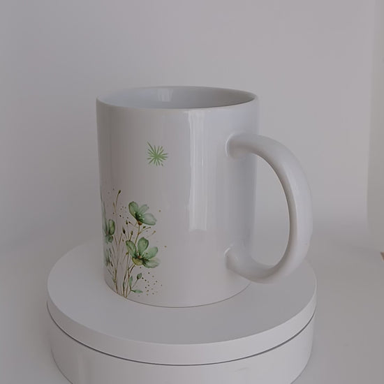 Tasse blanche en céramique sublimée avec des fleurs émeraudes.