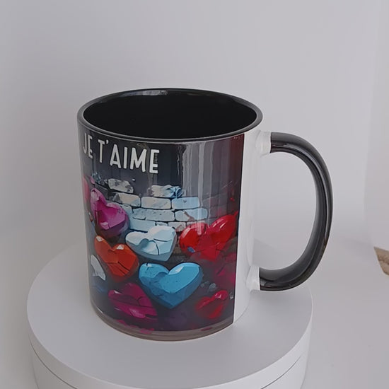 Tasse noire en céramique sublimée avec des cœurs et écrit "Bonjour mon cœur...je t'aime "
