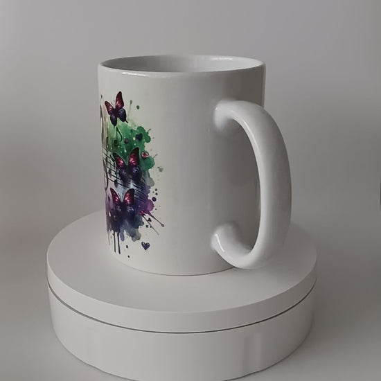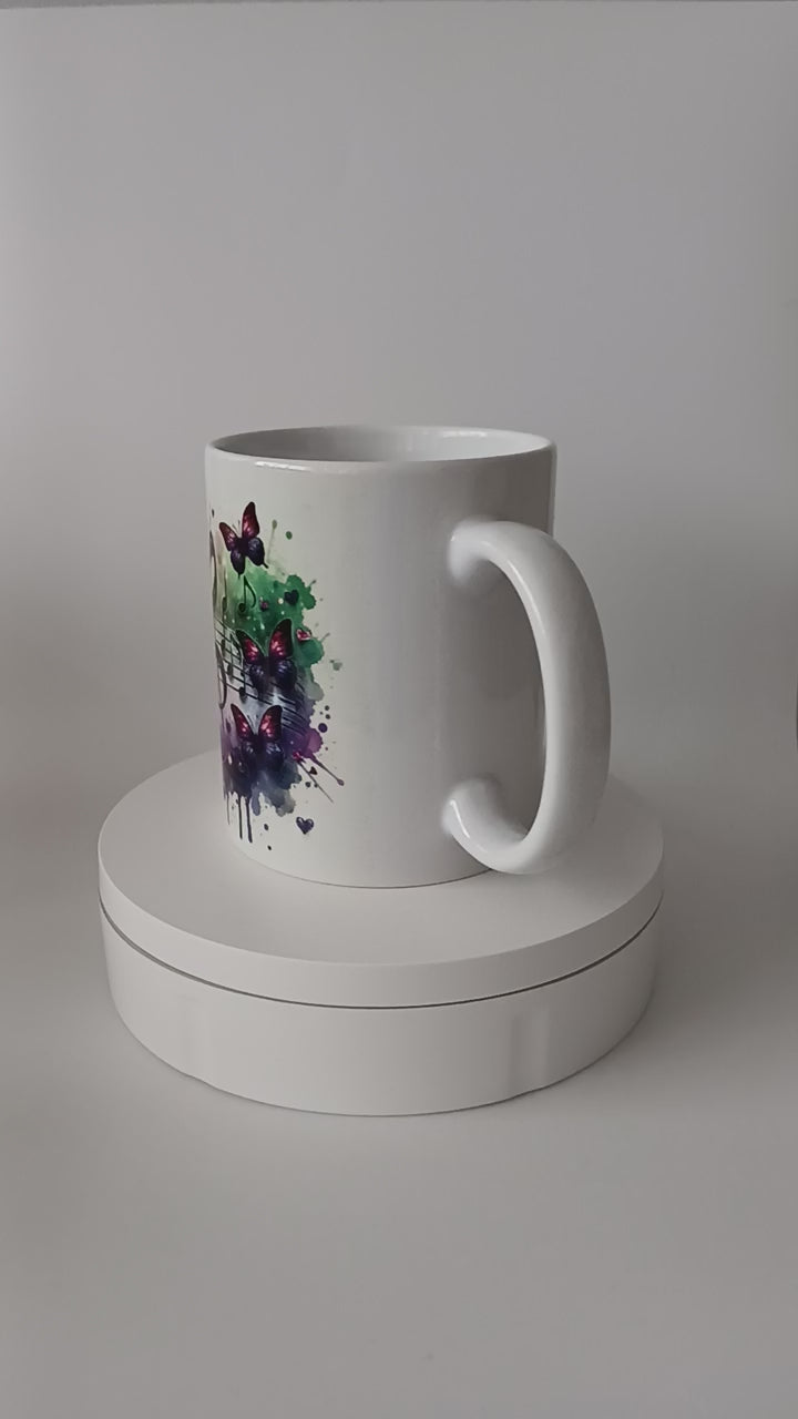 Tasse blanche en céramique sublimée avec des papillons et note de musique".